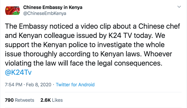 “The Embassy noticed a video clip about a Chinese chef and Kenyan colleague issued by K24 TV today. We support the Kenyan police to investigate the whole issue thoroughly according to Kenyan laws. Whoever violating the law will face the legal consequences,” the embassy tweeted on February 8.