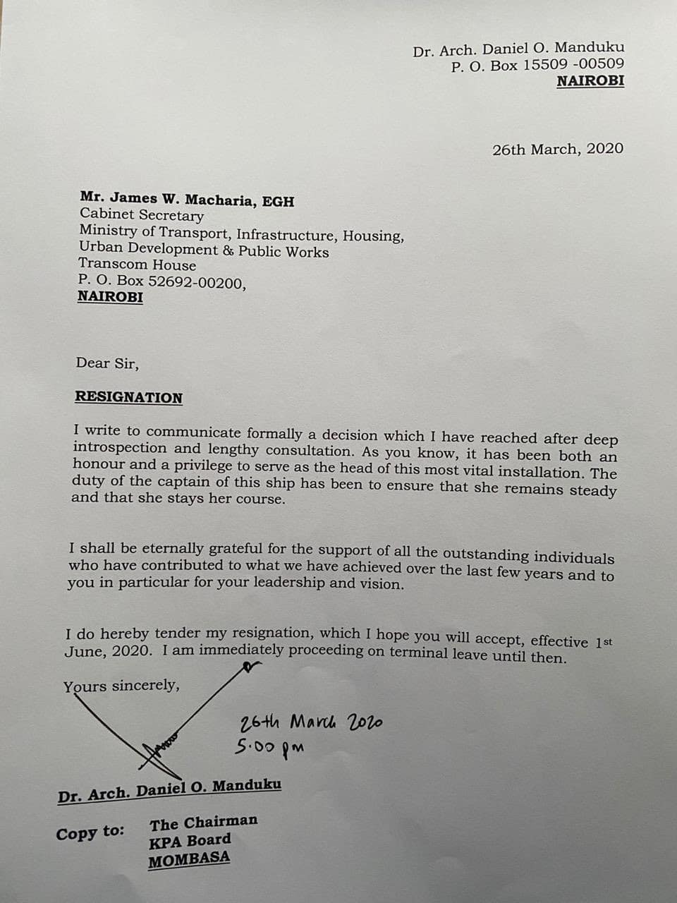 Dr Manduku, the architect at the helm of the now controversial Kenya Ports Authority, handed his resignation letter to Transport Cabinet Secretary James Macharia.